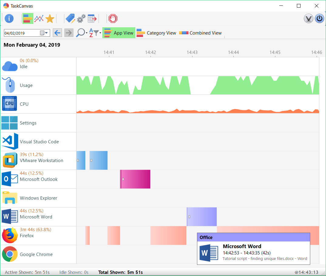 TaskCanvas is a program that allows you to track your computer usage throughout the day. It records the time when applications are used, along with other information such as open documents, etc. Active usage, idle time and CPU usage are also tracked.