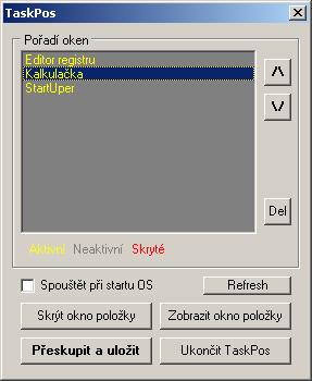 The program can rearrange the order of windows (bookmarks) on the taskbar (bottom bar of the system) according to the set order. Use the buttons to set the window order, save the settings, and hide or show the item's window (the refresh button refreshes the window list and Del clears the item from the list). The active window is highlighted, and TaskPos can also be set to start automatically when the OS boots. The program remains displayed in the tray and can be left-clicked via this icon to redisplay it (double-click, a simple click will reorder - useful when starting a program that is in the item list again, when a click will reorder without displaying the TaskPos window) or right-click to bring up the menu and select End to exit the program.