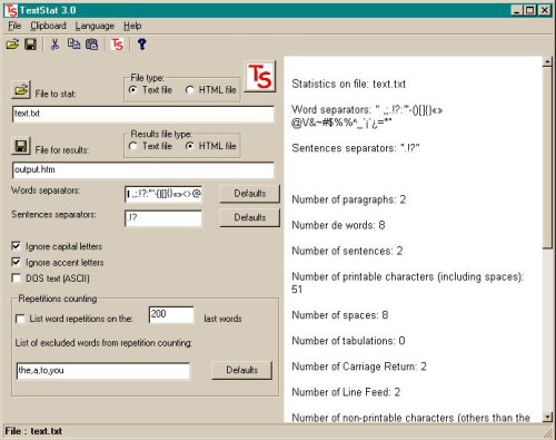 This program provides you with various information and data about a text or HTML file. The statistics of a given file include, for example: number of lines, words, characters, sentences, etc.
