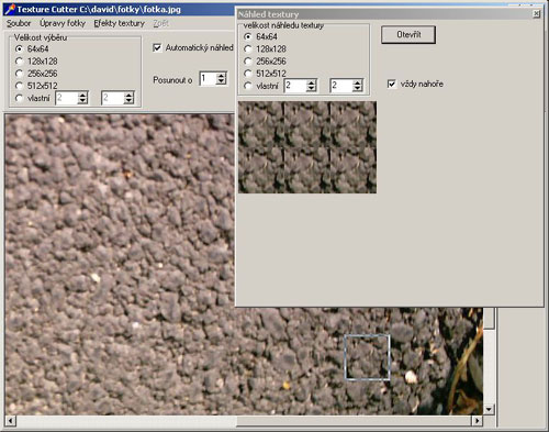 First you need to use a digital camera to get a suitable photo of the desired object. After opening the file in the program, the photo can be resized and the selection size can be adjusted. In order to create a smoothly following texture, it is necessary to find a suitable position of the selection using the mouse, buttons or arrow keys on the keyboard. If you require a high quality transition it is advisable to follow the preview when moving the selection. The created texture can be saved in BMP format.