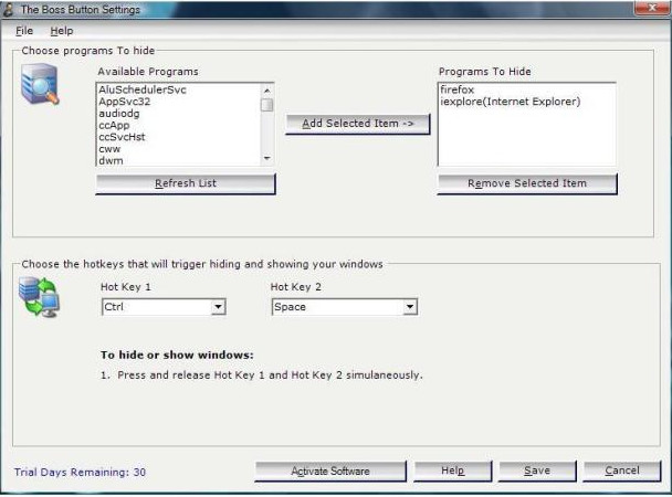 The Boss Button is very simple to use. Just install the program and then add the apps you want to hide. You can also set custom keyboard shortcuts for each window.
