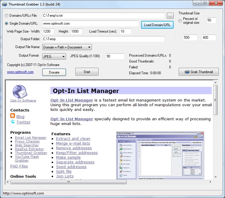 Thumbnail Grabber is a tool for creating JPEG or PNG screenshots of web pages.
