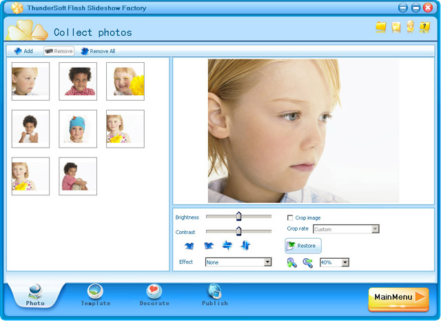 ThunderSoft Slideshow Factory is an easy-to-use software package that allows you to create slideshows from your images and videos. You can add transition effects, use subtitles, play music, use clipart and more. It includes more than 70 different animation templates. You can publish the finished presentation as a SWF movie or as an executable screensaver.