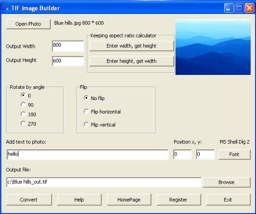 TIF Image Builder is a program designed to convert many graphic formats such as BMP, GIF, PNG, JPG/JPEG, ICO, TIF, EXIF, WMF, EMF to TIF or TIFF files by changing some parameters. Photos can be easily rotated, resized, etc. Various texts and watermarks can be set into the image. The program can also convert animation images to TIF file.