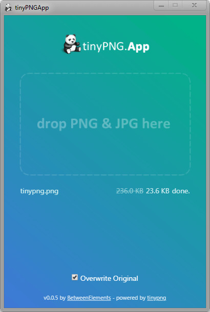 tinyPNG.App is very easy to use. Just drag and drop your files into the application window and tinyPNG.App will automatically optimize them. The program supports PNG and JPG files.