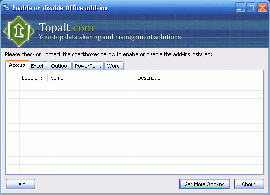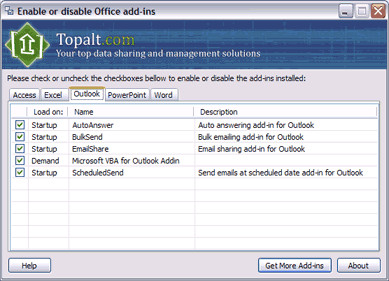 Topalt EnableDisable is an easy-to-use tool that allows you to manage add-ins in Microsoft Office applications. With it, you can turn add-ons on, off, update and uninstall them.