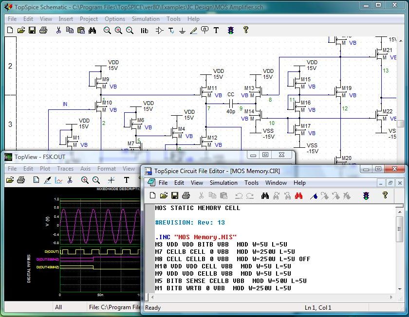 The TopSpice software is designed for the design and simulation of complex electrical circuits. It contains a large library of usable components and elements (integrated circuits, optoelectronic devices and magnetic parts, power semiconductors, SMPS design models, cables or tubes. The software also includes a manual and more than 350 example files.