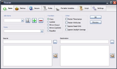 Toucan is a small utility that allows you to sync, backup and secure your data with multiple options. The program window is divided into 7 tabs for better and easier navigation and searching for the necessary functions.