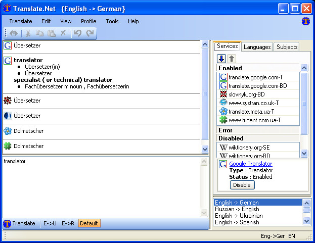 It now supports 41 language service websites, 53 services, 70 languages, and more than 4,000 translation directions, including the Google translator and dictionary, Wikipedia and Wiktionary, Yahoo Babel Fish translator, SYSTRAN translator, Merriam-Webster dictionary and thesaurus. For a complete list of supported services and languages, visit the program page.