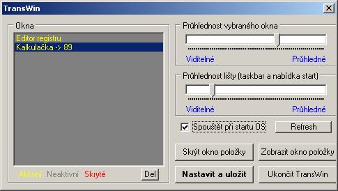 The program can set transparency for all visible windows in Windows 2000 and higher, including the taskbar (bottom system tray) and Start menu. Use the sliders to adjust the transparency of windows and the taskbar, including the Start menu, use the buttons to save the settings, and hide or show the item's window (the refresh button refreshes the list of windows and Del clears the item from the list). The active window is highlighted and TransWin can also be set to start automatically after OS boot. The program remains displayed in the tray and can be redisplayed via this icon (double-click) or right-click to bring up the menu and select End to exit the program.