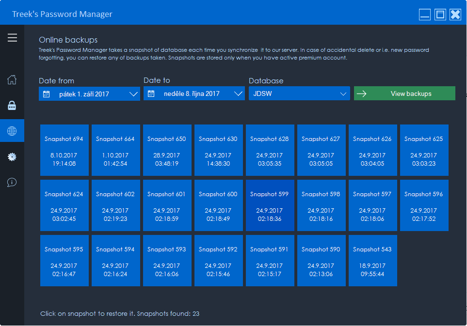Treeks Password Manager has been developed to provide a secure place to store passwords, credentials and other confidential notes. TPM allows you to create multiple databases and uses strong encryption to protect your data. You can choose to store your data locally or alternatively use a cloud service.