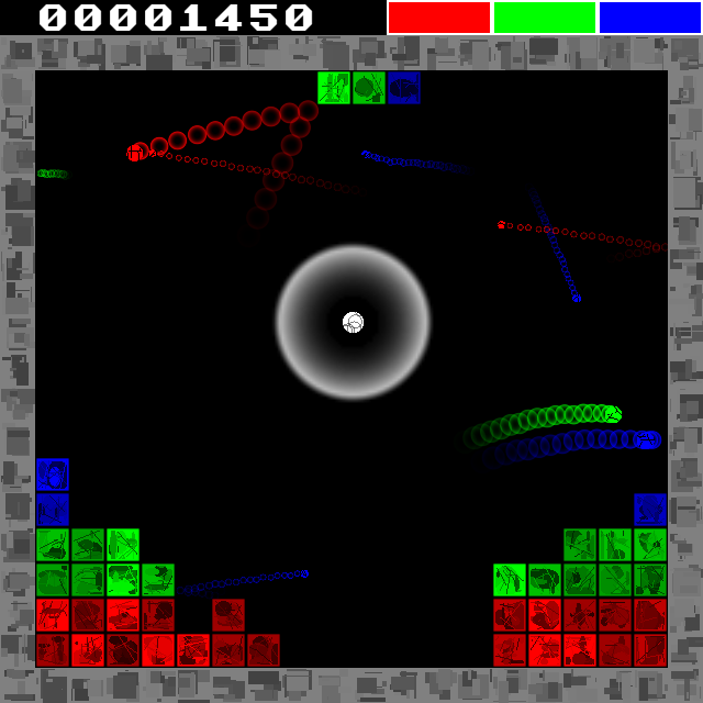 Using the mouse, you control a white ball, which is a kind of cursor that you use to slap the surface of the game board, changing the direction of the balls depending on how close the ball is to the center of the slap. If the ball is close to the slap, it will lose some of its energy. So you have to direct the balls so that they suck up their colours by hitting the coloured cubes, which replenishes their energy.