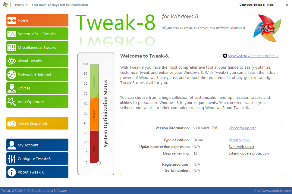 Tweak-8 is the latest standard in system tuning because it focuses on an easy-to-use user interface. The program includes hundreds of system enhancements and optimizations to system features without requiring any expertise from the user. Its main goal is to tune and optimize the system according to the categories listed in the left main navigation bar. It makes it easy for the user to find his way through the jungle of performance and customization enhancements.