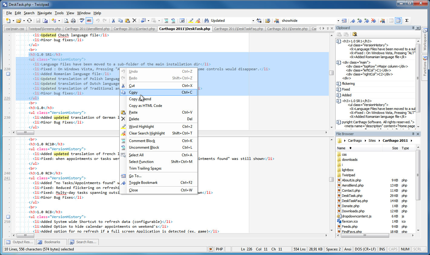 Twistpad is a full-featured text editor and code editor for Windows. It can be used as a replacement for Notes or as an editor with a focus on web and software development. Twistpad supports a variety of syntax highlighting (colored keywords) for most popular formats (HTML, ASP, XML, C++, Pascal, etc.). Manipulating text in this program is no problem, it offers a wide range of formatting commands that make your job easier.