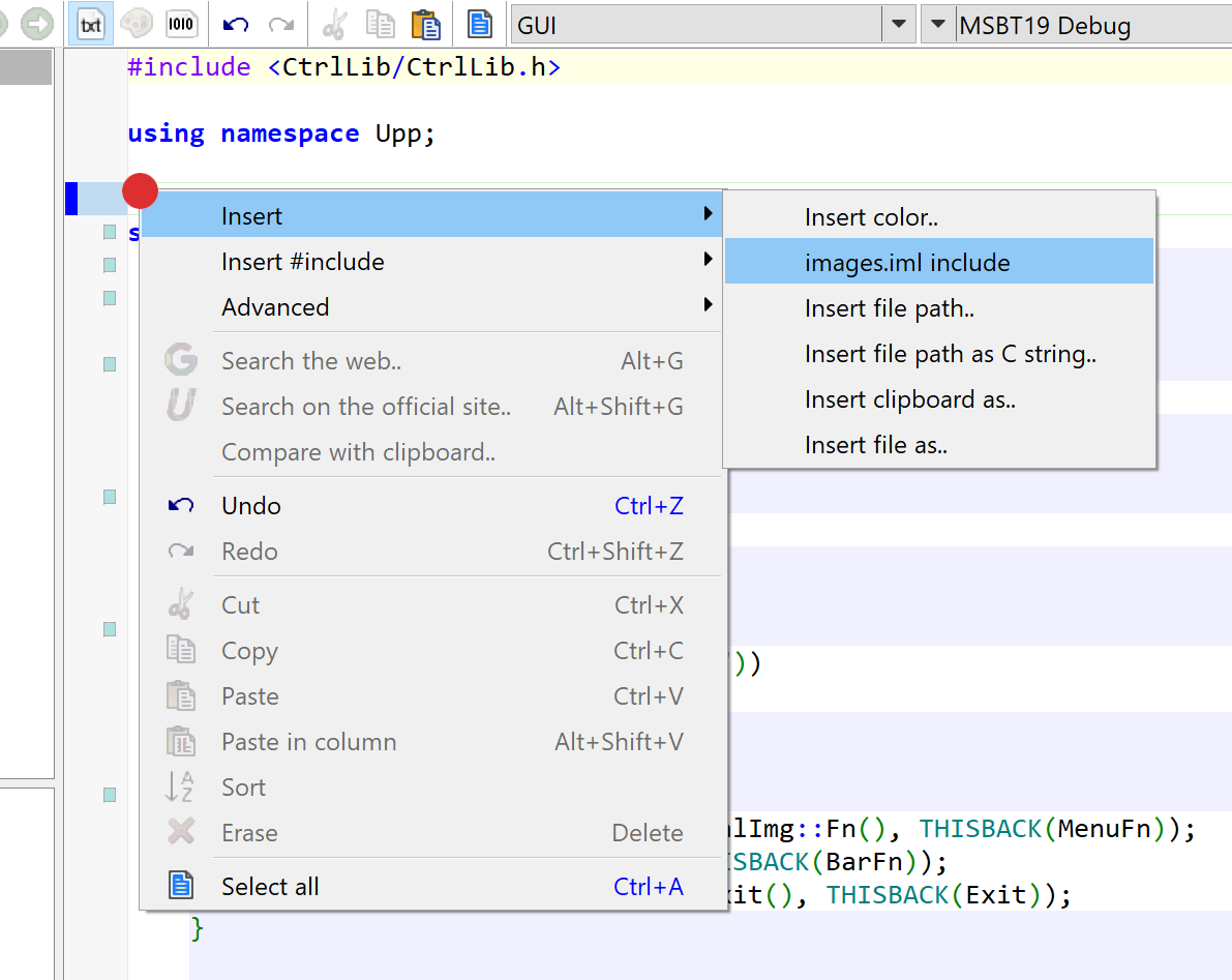 TheIDE can work with GCC, Clang, MinGW, and Visual C++, and includes a full-featured debugger. TheIDE can also be used to develop applications that are not in U++.