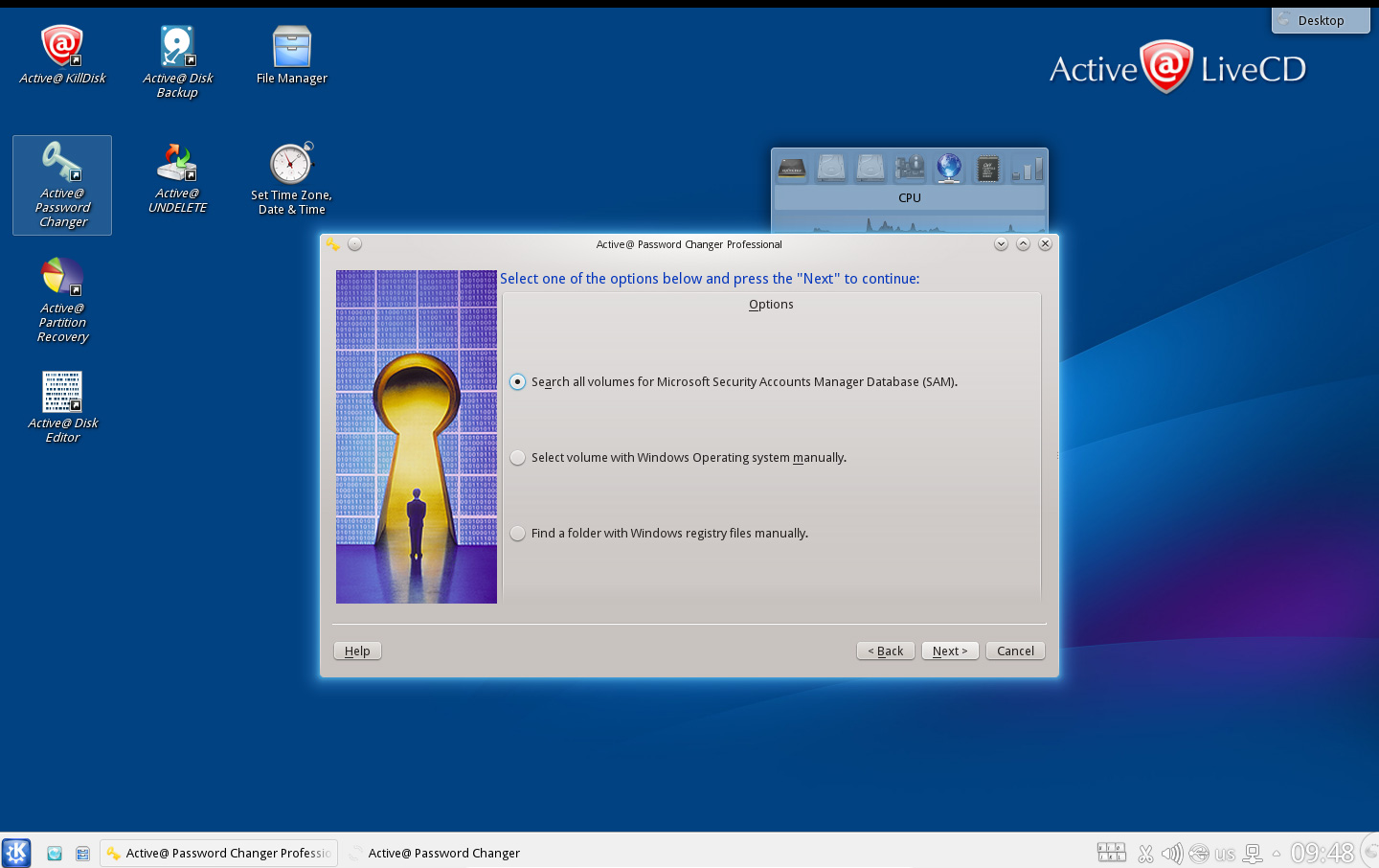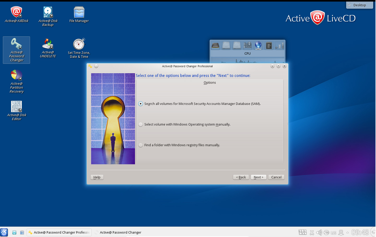 Ultimate Boot Disk Active@ LiveCD! wizard creates an .ISO file that you can immediately burn to a CD or copy to a USB drive, from which you can then boot, thus ensuring uninterrupted work with the disks and you can then try to recover your lost data or restore the system password or back up the system.