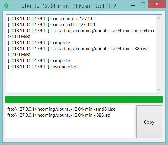 UpFTP is a tool inspired by Linux Mint's Upload Manager that allows you to share files using an FTP server in seconds. The application offers an easy way to copy files to an FTP server. In the window you can see a log of events - connection, start of upload and completion of upload. Progress bar informs about the size of the part of the file already uploaded.