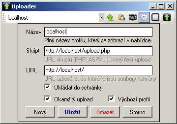 The green arrow will trigger a manual upload (with the "Instant Upload" option turned off. The traditional icon for "Insert" uploads the clipboard contents to the server - text to a text file (without formatting), image to a png file. The camera icon uploads the current screenshot (full) to the server. The cog opens the detail (settings) of the current profile, and you can change profiles by selecting from the drop-down menu. This is followed by an icon to display the log (log), which stores all important activities. The last icon with the Uploader logo is a link to the product page.