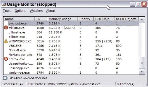 Usage Monitor is a monitoring tool for tracking the processes running on your computer. You can set different values and priorities for each process, memory usage, etc.