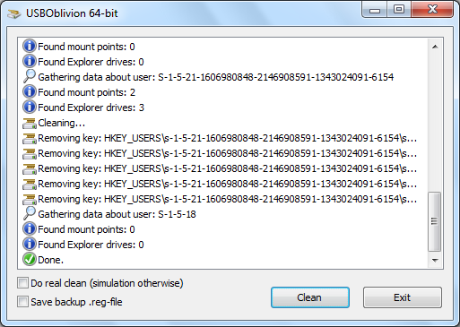 USBOblivion is designed to erase all traces of connected USB storage devices from the Windows registry. The tool works in a simulated mode that allows you to preview the result of the cleanup. Then the real erasing process can be started. The tool can also create registry backups for possible restoration.