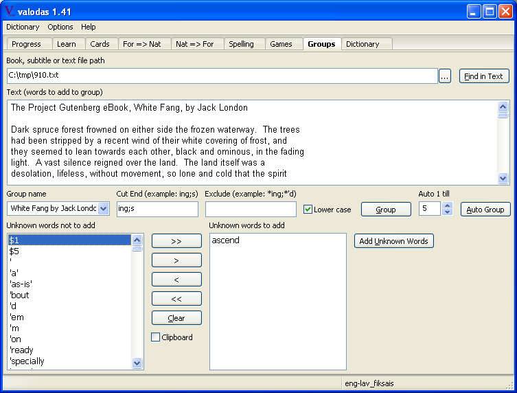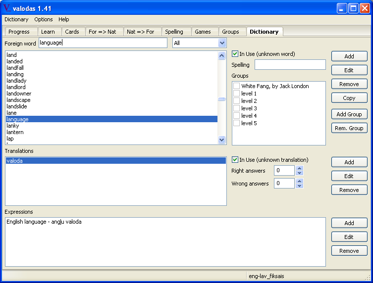 valodas - contains many dictionaries of different languages that can be downloaded from the program's website and offers the possibility to create your own dictionary.