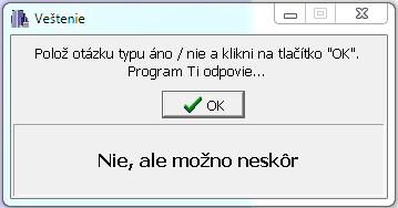 Veštenie is an app for moments of boredom, in which you ask yourself a question out loud and then press the "OK" button in the app. However, ask yourself questions that can be answered with a yes or no answer.