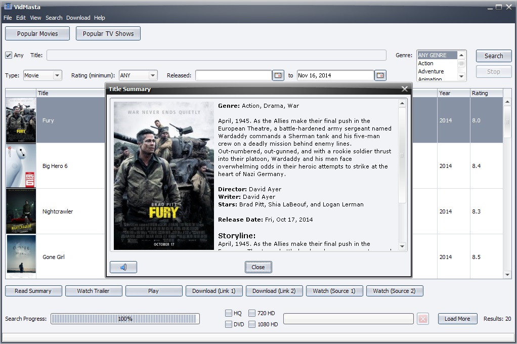 VidMasta is a program that allows you to search for and download a movie or TV title that is available online. You can also watch its trailer or read about its content. The program can also download subtitles.