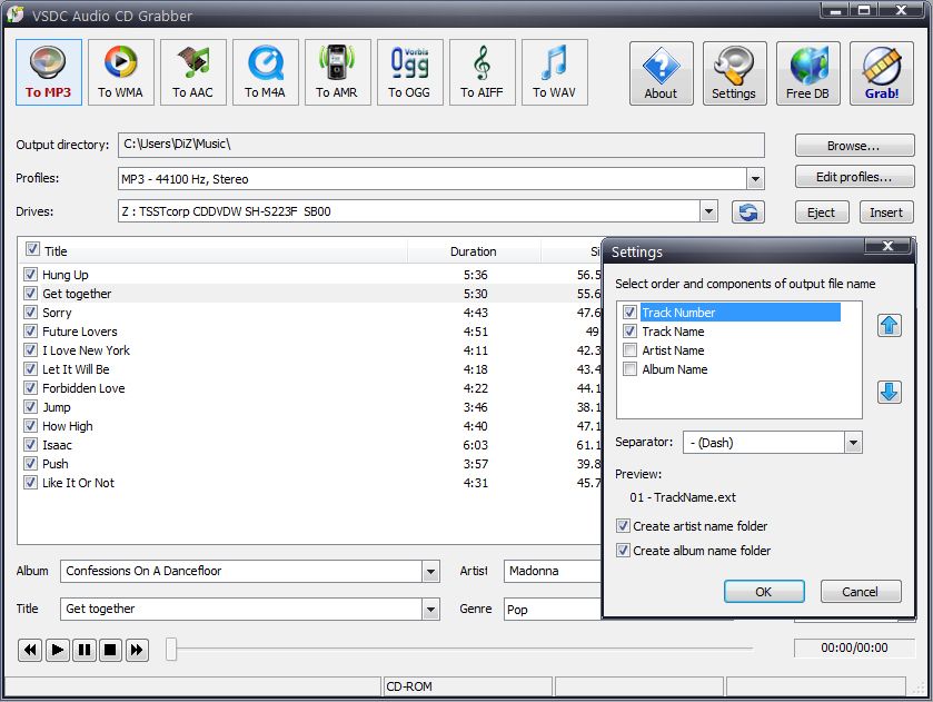 Using the FreeDB server, the program automatically recognizes song names and artists.