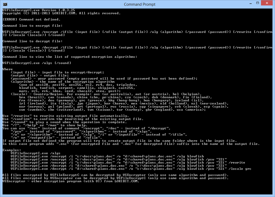 VSFileEncryptC is a small but powerful application that helps you to encrypt and decrypt files easily. It is a command line tool, so those who are used to working with the command line in Windows should not encounter functionality issues. On the other hand, inexperienced users will need to get used to the syntax as it is quite intuitive and simple. Since it is a command line application, VSFileEncryptC can be run from a USB flash drive. Thus, it is always and everywhere available. After launching, all you have to do is select the source file, specify the destination and choose the encryption algorithm you want to use, as the application supports several of them.