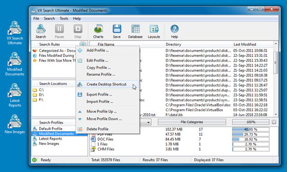 VX Search Pro is an automated solution for searching various files by type, file name, category, extension, location, size, creation date, last modified and accessed file, username, file attribute, JPEG EXIF tags, etc.