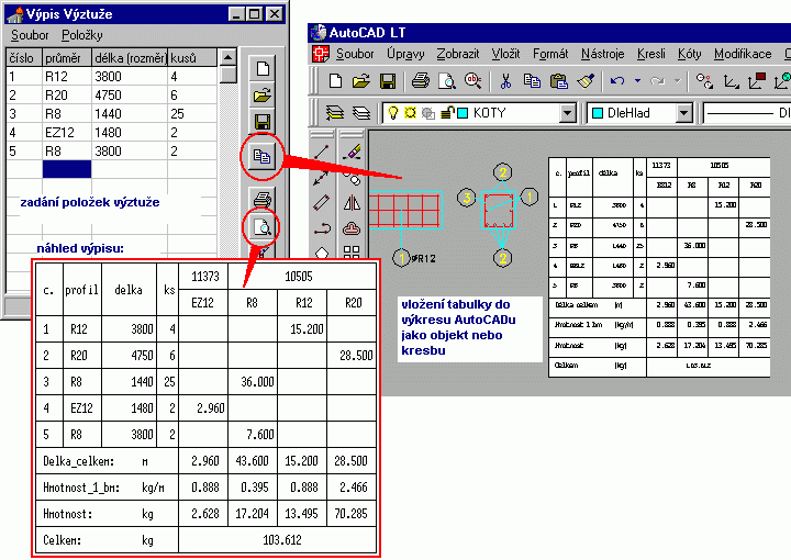 The resulting table can be printed or inserted directly into the reinforcement drawing (AutoCAD, etc.). It can be inserted as a drawing-entity or as an OLE object.