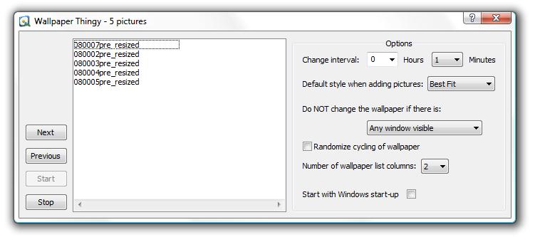 Wallpaper Thingy is a simple tool for automatically changing wallpapers on your desktop. You put the desired images into the list and can set it to randomly select or display them in order in the list. You can specify the time interval after which the wallpapers will be changed.