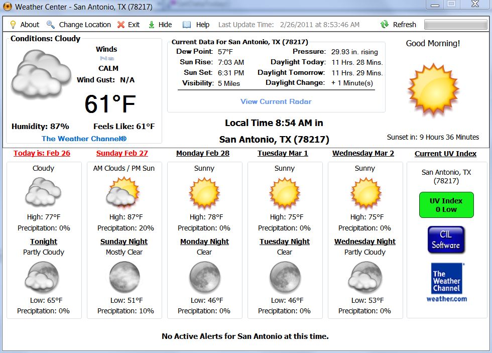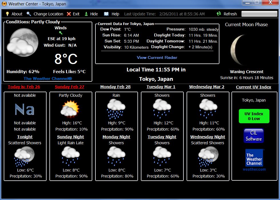 Weather Center is a program located in the system tray that displays the current temperature and weather information next to the clock. It displays weather information for different parts of the world. The application is preferably set to display the current weather in different parts of the US, but it is possible to monitor the weather in other countries as well. The app has a very nice and clear look!