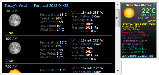 Weather Meter gadget covers up to 3 million cities and urban locations worldwide including displaying Hi Lo temperature during the day, feel, humidity, visibility, pressure, wind speed, wind direction, cloud cover, precipitation, sunrise, sunset, moonrise, sunset and more.