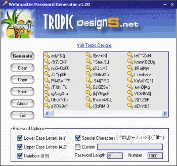 Webmaster Password Generator is a simple utility that allows you to generate random passwords. It can be generated according to various criteria, such as: length, upper and lower case letters, numbers, etc. The generated passwords can be copied to the clipboard or saved to a text file.