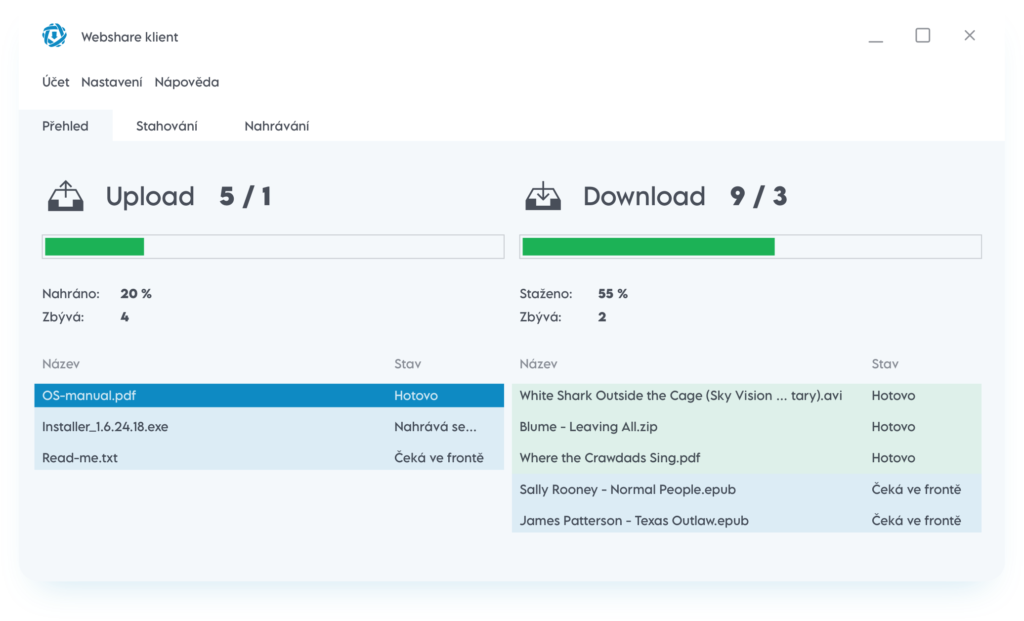 Webshare client is a useful helper for uploading and downloading webshare.cz content. Want to use the maximum potential of downloading? Activate your VIP account. Organize your files, move, rename. Everything is at your disposal. Don't want to flit between client and web? You can search in the app too.