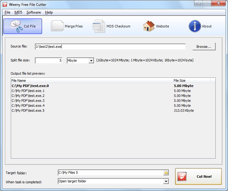 Free File Cutter helps you share or backup a large file. For example, a file over 10GB in size can be split into smaller parts, which can then be burned to a DVD, copied to a USB drive, or uploaded to online storage.
