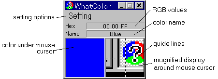 WhatColor is a simple applet used to display the RRGGBB color code under the cursor. The program runs in the notification area when it is started and, when enabled, continuously displays the color codes in a small window next to the cursor. However, the icon in the notification area can be used to pause the program at any time or to exit it completely.