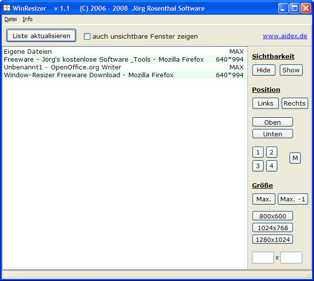 Window Resizer resizes and repositions application windows on your desktop. In addition, you can set individual windows to always appear at the top of your desktop. This is very useful if you need to permanently display content in one window, for example when copying data. Freeware.