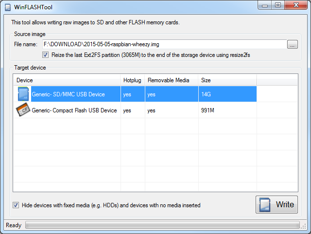 WinFLASHTool is a small utility for writing disk images to SD cards and other memory cards, under Windows. It supports multi-partition cards and images and provides more security when checking the partition list before overwriting the device.