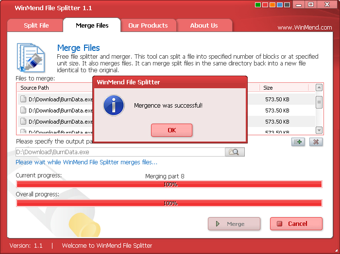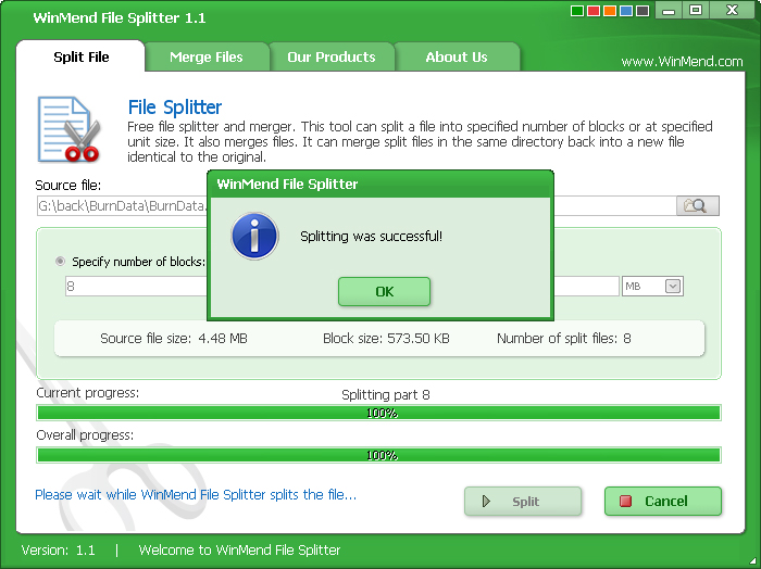 WinMend File Splitter is a unique file splitting and merging software. The program works according to your settings and output requirements (splitting into a certain number of parts, size, etc.).