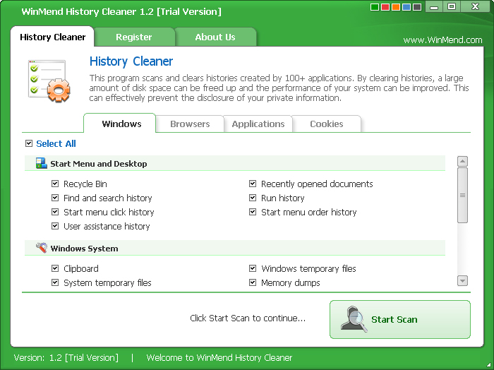 WinMend History Cleaner is a utility that completely cleans the history created by various programs on the system. It allows you to efficiently search and clean the history generated by more than 100 programs. It removes history including cookies, browsing history and cash files of Internet Explorer, Firefox and history of a large number of applications such as Microsoft Office, WinRAR, Windows Media Player and RealPlayer.