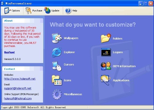 WinPersonalizer is an integrated tool that provides a way to change the look and feel of your Windows. With this utility you can change the appearance of your desktop wallpaper, icons, cursors, IE skins, folders. You can also edit OEM information on your computer. In addition, for MSIE browser you can change its appearance by using skins.