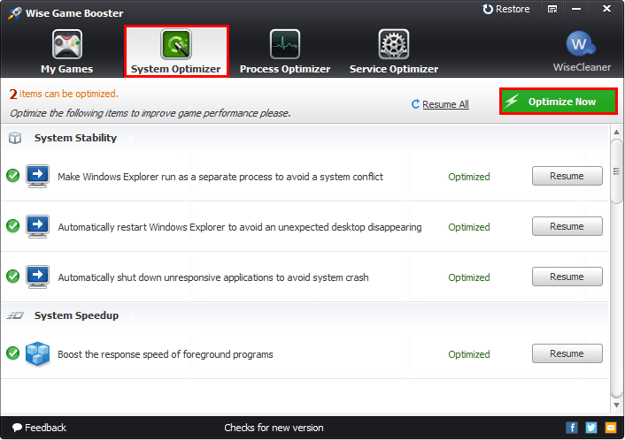 System Optimizer in Wise Game Booster optimizes relevant system settings to improve stability and speed of the system runtime and put your computer into game mode.