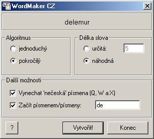 The latest version 1.00 has two word generation algorithms. The first one is a simple algorithm. It builds words in a consonant-vowel-... way (e.g. joko, lycos, zanex, ...). The second algorithm is advanced. It builds words based on the so-called "conditions of correspondence of pairs of letters of the alphabet" (these conditions are based on the Czech language). You can then choose your own or random length of the word being built. The program also has the option to omit the "non-English" letters Q, W and X, and you can also set how the word will start.