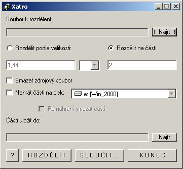 Do you like to transfer files on floppy disks? Probably not, but sometimes you just have to. You've probably noticed that 99 times out of 100, the capacity of floppy disks is insufficient. If you're transferring an entire directory with multiple files it's easy, but what if you're only transferring one file and it's over 1.44MB? (And that happens a lot.) Swearing won't help, but this program might. It can split just such a file into parts (by number of parts or by size) and then put it back together again. It includes a number of other options for splitting the file. The program can be transferred to other computers on a floppy disk (it fits there without any problems). Just load the directory you installed the program to onto the floppy after installation.