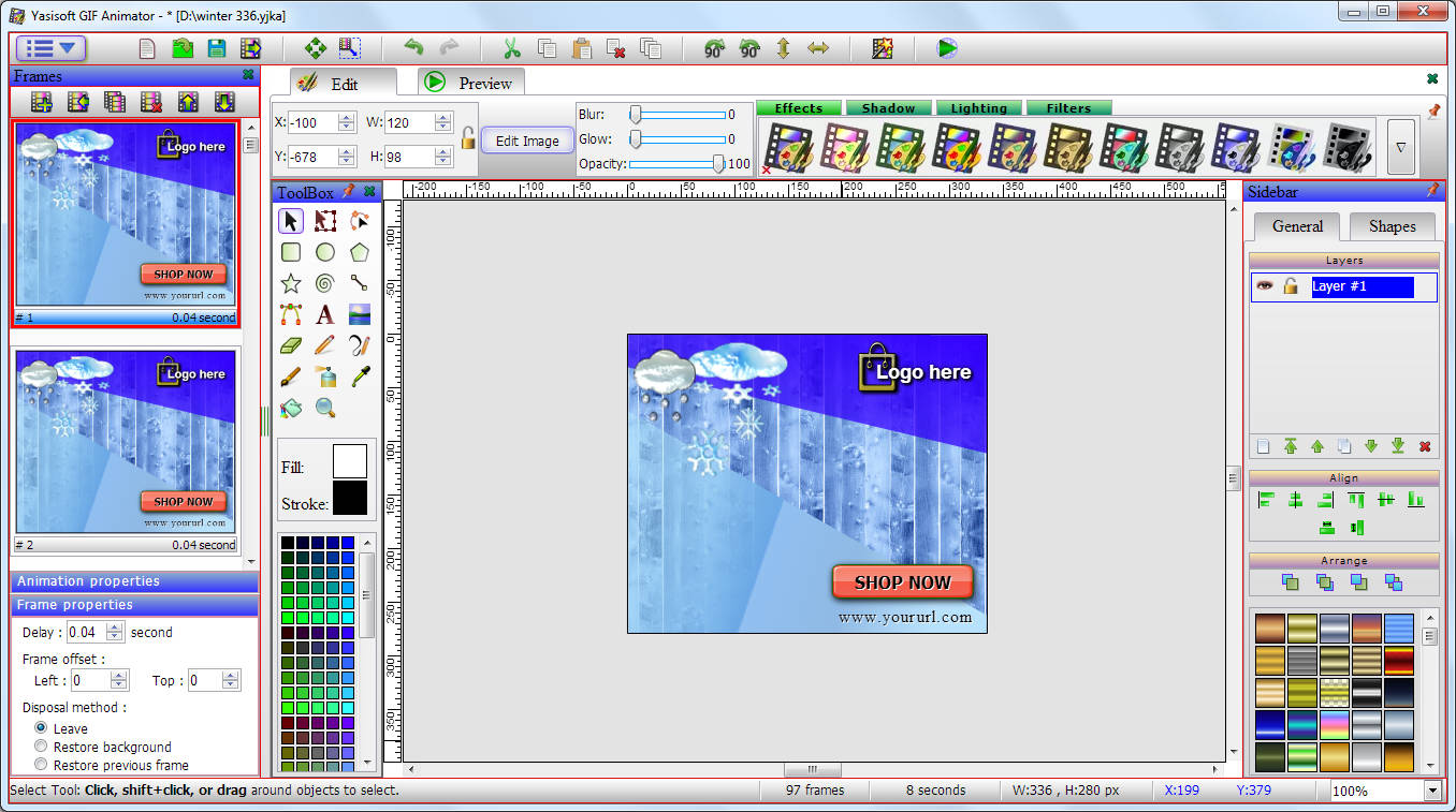 Yasisoft GIF Animator is an easy-to-use and powerful tool for creating animated GIF images. You can easily create animated banners, buttons, images and even cartoons. With a powerful built-in image editor, you don't need Photoshop, Gimp or any other editor.
