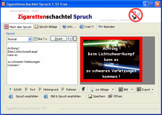 Zigarettenschachtel-Spruch is a program with which you can create your own funny catchphrases for cigarette packs and then print them. A print preview is also integrated.