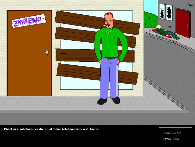 This game, with its brutality and vulgarity, is unparalleled in the Czech freeware scene and therefore not suitable for young children. The graphics are very simple, but even so the individual scenes can be impressive and disgusting. Nothing for the weaker natures. In this episode you have the task to get to the hospital where your friend is lying, who smuggled diamonds in his belly and then to get them.