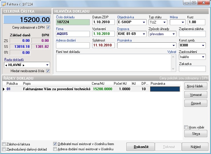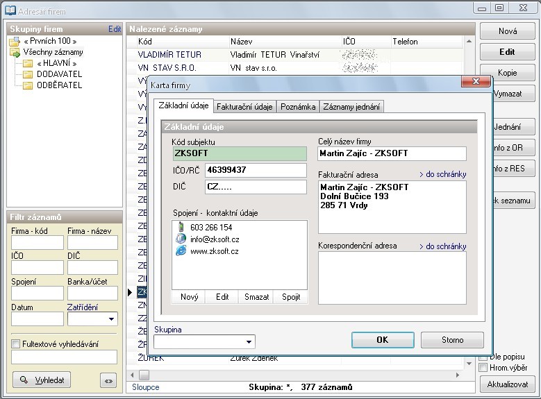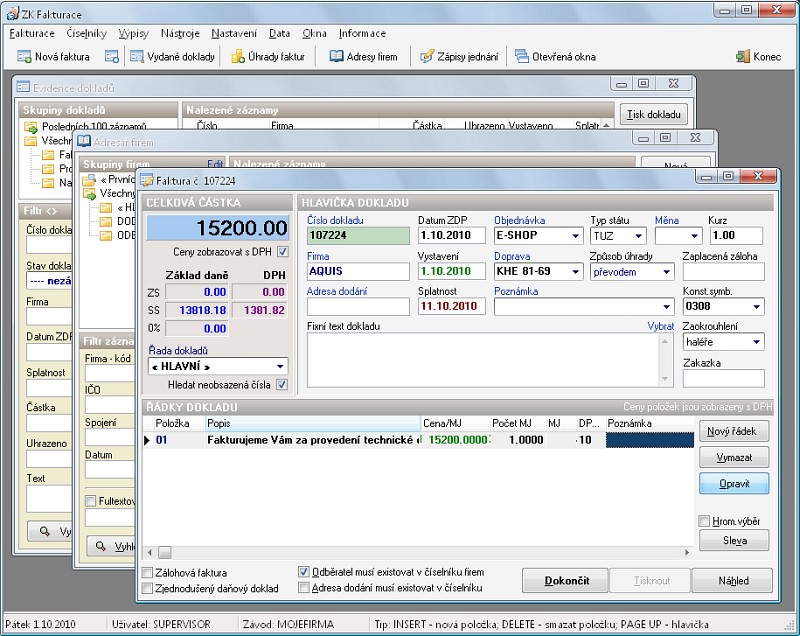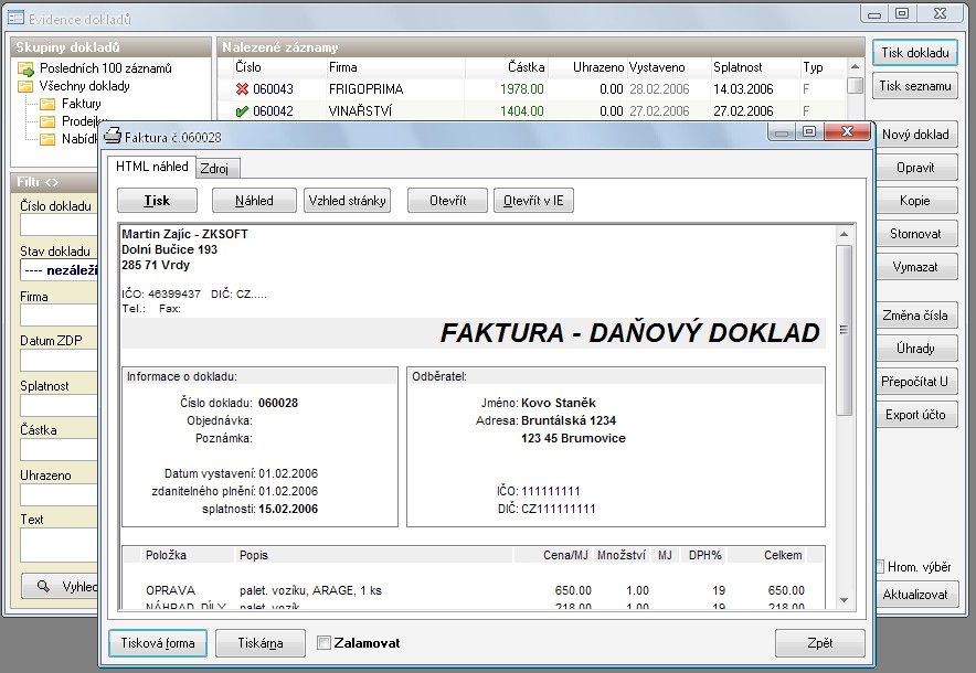 The ZK Invoices program is a program for recording and creating tax documents, advance documents and cash sales. It is based on a modern MDI (Multiple Document Interface), which allows simultaneous editing of multiple documents and number lists. In addition to the document registration module, it includes a complete company directory, document payment records, a simple codebook of items used and a CRM module of meeting records. Together with simple or double-entry bookkeeping, it forms the basic agenda of the company. It is suitable for both VAT and non-VAT payers.